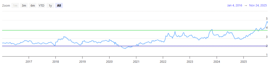 From a dividend policy perspective, the company is still relatively young, but its track record looks promising. It initiated a dividend in 2024 of 0.15 cents per share quarterly and increased it by 13.4% to 0.17 cents this year. We should hear the 2026 dividend soon.