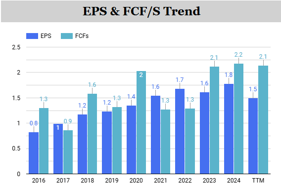The company went public in 2016 through an IPO by an investment vehicle and only recently began paying a dividend. Since then, it has performed reasonably well fundamentally, nearly doubling its earnings per share and free cash flow – broadly in line with what one might expect from a slow-growing consumer staple.