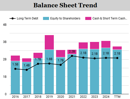 The balance sheet is also weak, largely due to past share repurchases that exceeded net income, eroding shareholders’ equity and leaving the balance sheet heavily reliant on liabilities. On the positive side, the interest coverage ratio stands at 11, meaning the company can comfortably meet its interest obligations.