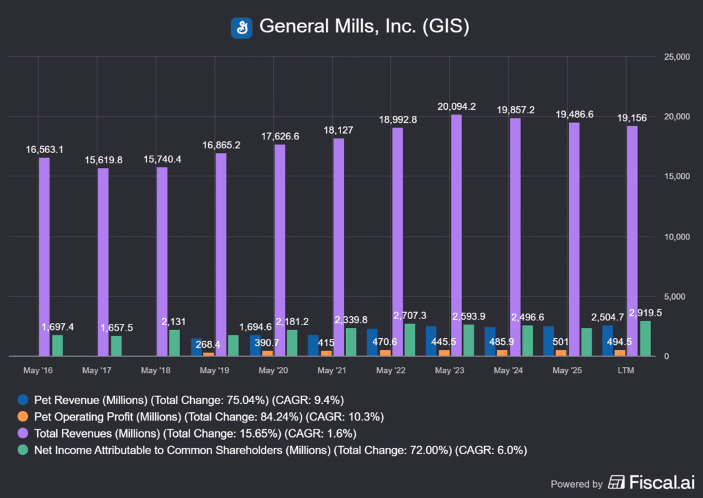 That said, I do think General Mills overpaid for the acquisition. The business generates around 500 million USD in annual operating profit, which implies a valuation north of 20 times earnings, while growth in that segment has been sluggish as of late. Still, it represents roughly 12% of total revenue and about 20% of net income, making it one of the company’s most profitable divisions.