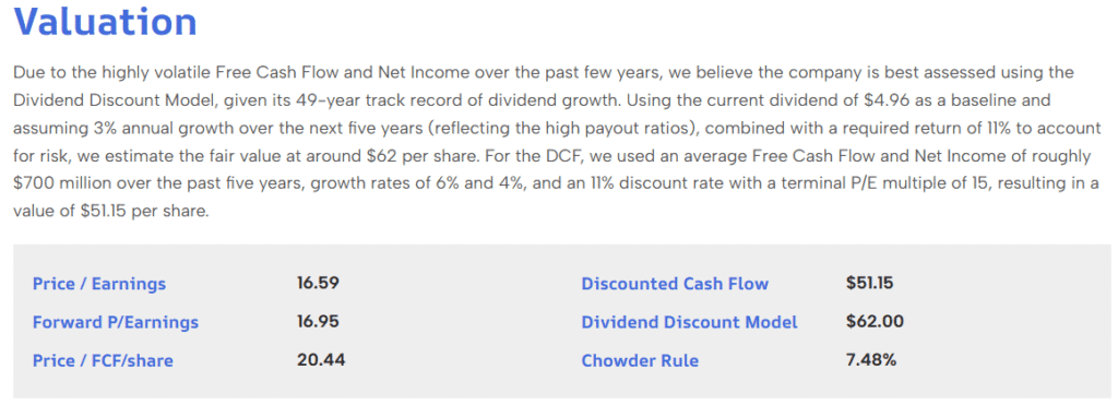 In terms of valuation, we find the stock still expensive. We assess a fair value of around $62, roughly a third of what it traded for two years ago. Based on multiples, discounted cash flow, and dividend discount models, this appears reasonable, translating to a dividend yield of approximately 8%.